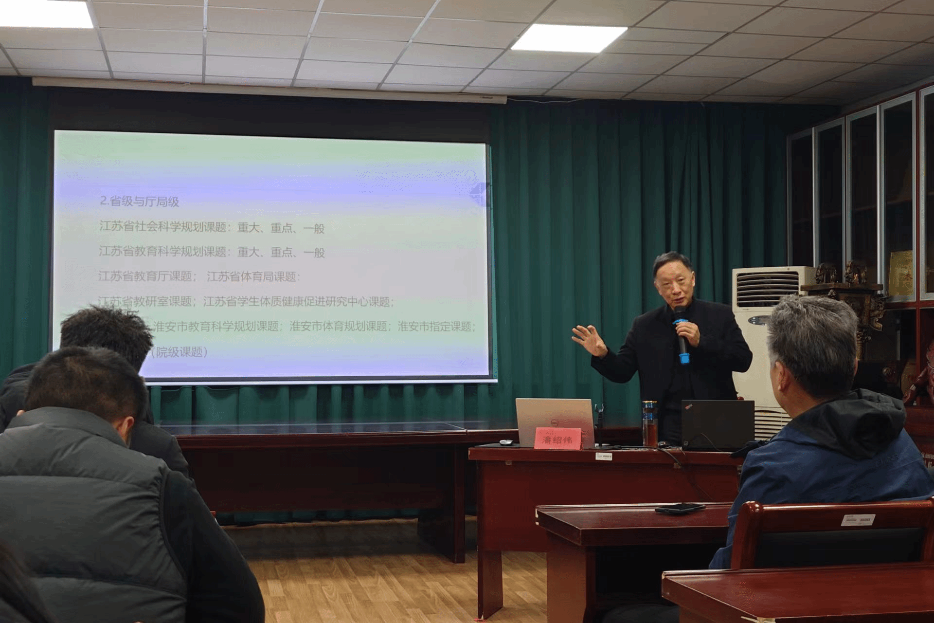 为进一步推进AB.COM有组织科研,凝聚力量、打造队伍,2024年1月15日下午15.00,教育部全国高等学校体育教学指导委员会委员、中国体育科学学会学校体育专业委员会委员、扬州大学二级教授、扬州大学体育科学学院院长潘邵伟教授在我院大会议室举行《科学研究课题撰写与申报技巧》专题讲座。