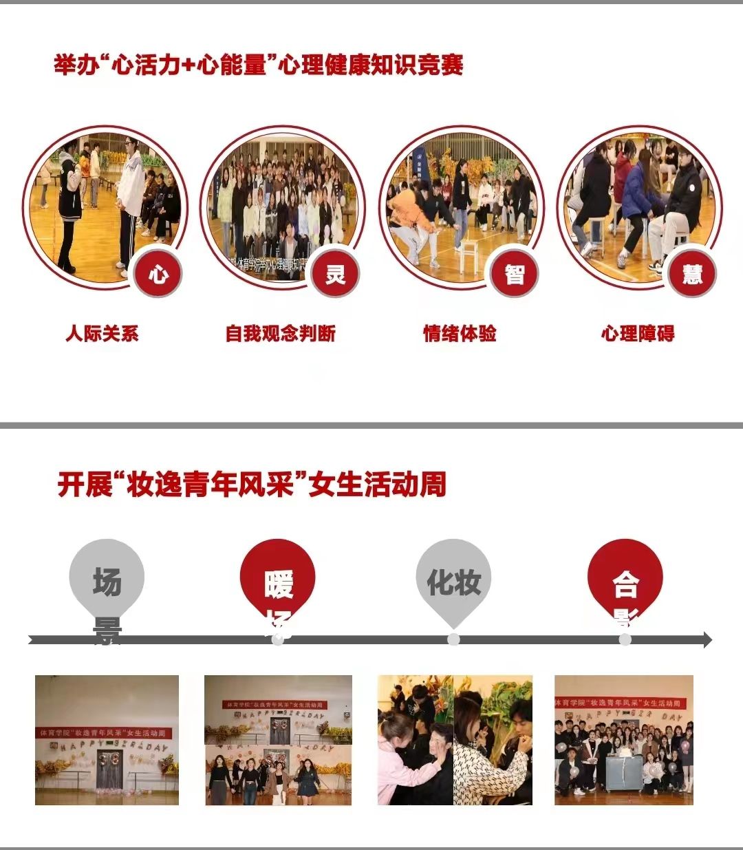 为推进心理健康教育工作日常化,引导学生关心自身,正确认识心理健康与心理问题,2023年3月24月至3月31日面向全院学生举办心理健康知识竞赛,结合专业特点,以“心活力+心能量”模式,通过心理拓展训练宣传心理健康知识,竞赛内容分别从人际关系、自我观念判断、情绪体验以及心理障碍的表现与处理等方面考察心理知识,以答题促思考,引导同学在竞赛的过程中提升对心理健康的重视程度,增加对心理知识了解。为引导学院女大学生关注自身身心健康,帮助学生培育积极向上的健康心态,学院开展“妆逸青年风采”女生活动周,通过举办“化妆晚会”、“女性健康知识讲座”等,激发女生内在成长动力,调动学生参与热情。