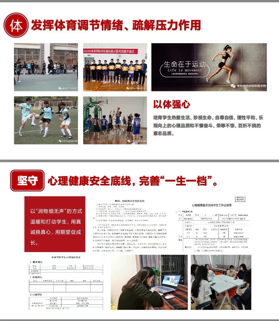 教育部等十七部门联合印发《全面加强和改进新时代学生心理健康工作专项行动计划(2023—2025年)》(下称《行动计划》),提出“以德育心”“以智慧心”“以体强心”“以美润心”和“以劳健心”的五育并举促进心理健康的教育方案,其中,以体强心是指发挥体育调节情绪、疏解压力作用,培育学生热爱生活、珍视生命、自尊自信、理性平和、乐观向上的心理品质和不懈奋斗、荣辱不惊、百折不挠的意志品质。这也是本年度学院心理健康工作的目标导向。