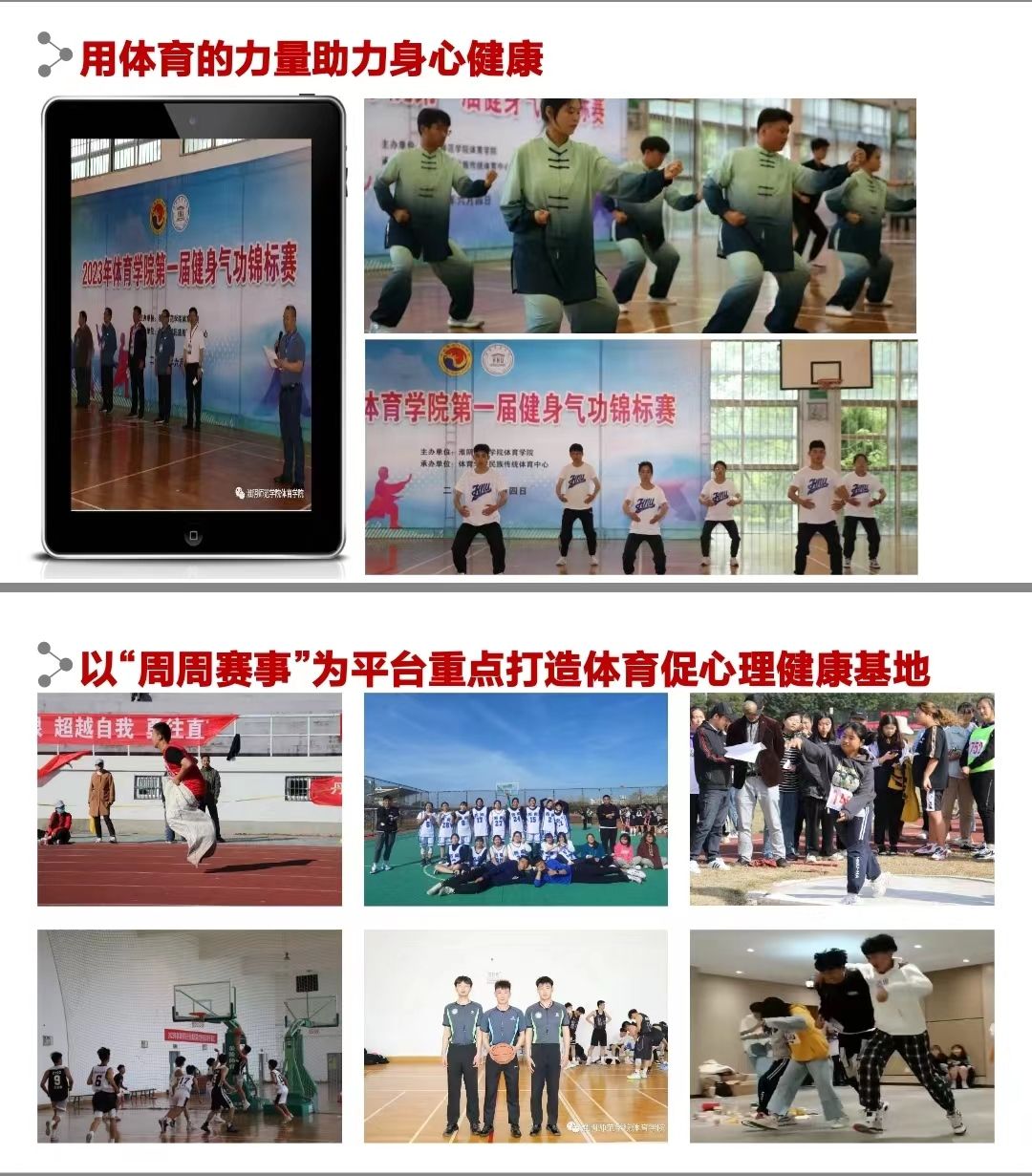 生命在于运动,而运动赋予我们健康。体育锻炼有助于减轻心理压力,完善心理素质,改善心理健康等。学院坚持以“体心融合”为指引,开展心理健康教育工作,结合专业特色,丰富同学们课余文化生活、培养学生团队合作精神,提高人际沟通能力,在增强体育锻炼的基础上,帮助学生释放压力放松心情。学院举办教师基本功技能大赛,以全面提高师范生综合素质为本,以赛促学、以赛促练,体育学子踊跃参与,奋勇争先,用体育的力量助力身心健康。以“周周赛事”为平台重点打造体育促心理健康基地,通过专题讲座、网络直播等方式,扩大体育运动对提高学生心理健康水平的宣传力度。学院领导重视,专业教师尽职,体育学子积极,在篮球、足球等赛事中切磋技术,培养人际关系,提高团结协作能力。将体育运动作为心理健康干预的手段,运用到心理健康问题学生教育和干预中,尤其对学生中的心理亚健康人群进行重点监控,并有针对性地对该人群进行合理的体育运动干预,以提高大学生的心理健康水平。