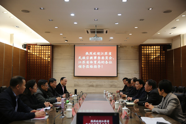 上午,江苏省民族宗教事务委员会、江苏省体育局领导到淮阴师范学院指导民族传统体育工作,淮阴师范学院副校长韩同友、淮安市民宗局、体育局领导和淮阴师范学院AB.COM领导参加会议。