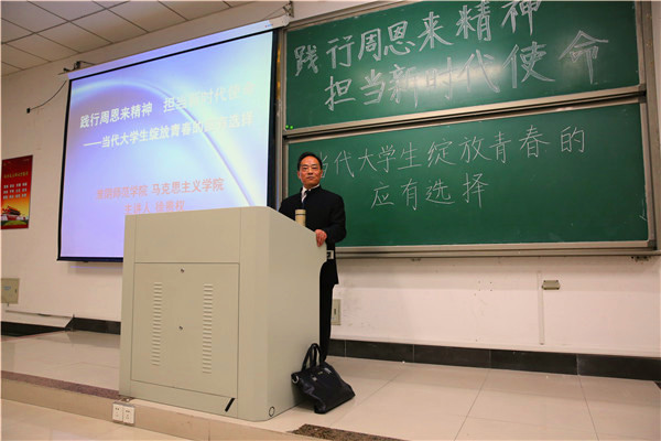 徐老师总结了几点周恩来精神,希望同学们谨记在心:一是要确立信仰,树立理想。在新时代,我们每一个人都需要有对美好生活、对现代化强国、中国梦的向往和追求。二是要坚守和坚定,不管风吹浪打,胜似闲庭信步,执着追求。三是要把向往、追求融入大学生活,努力提升自己的综合素质,为走上社会接力中国梦、弄潮新时代、显示人生奠定坚实基础。