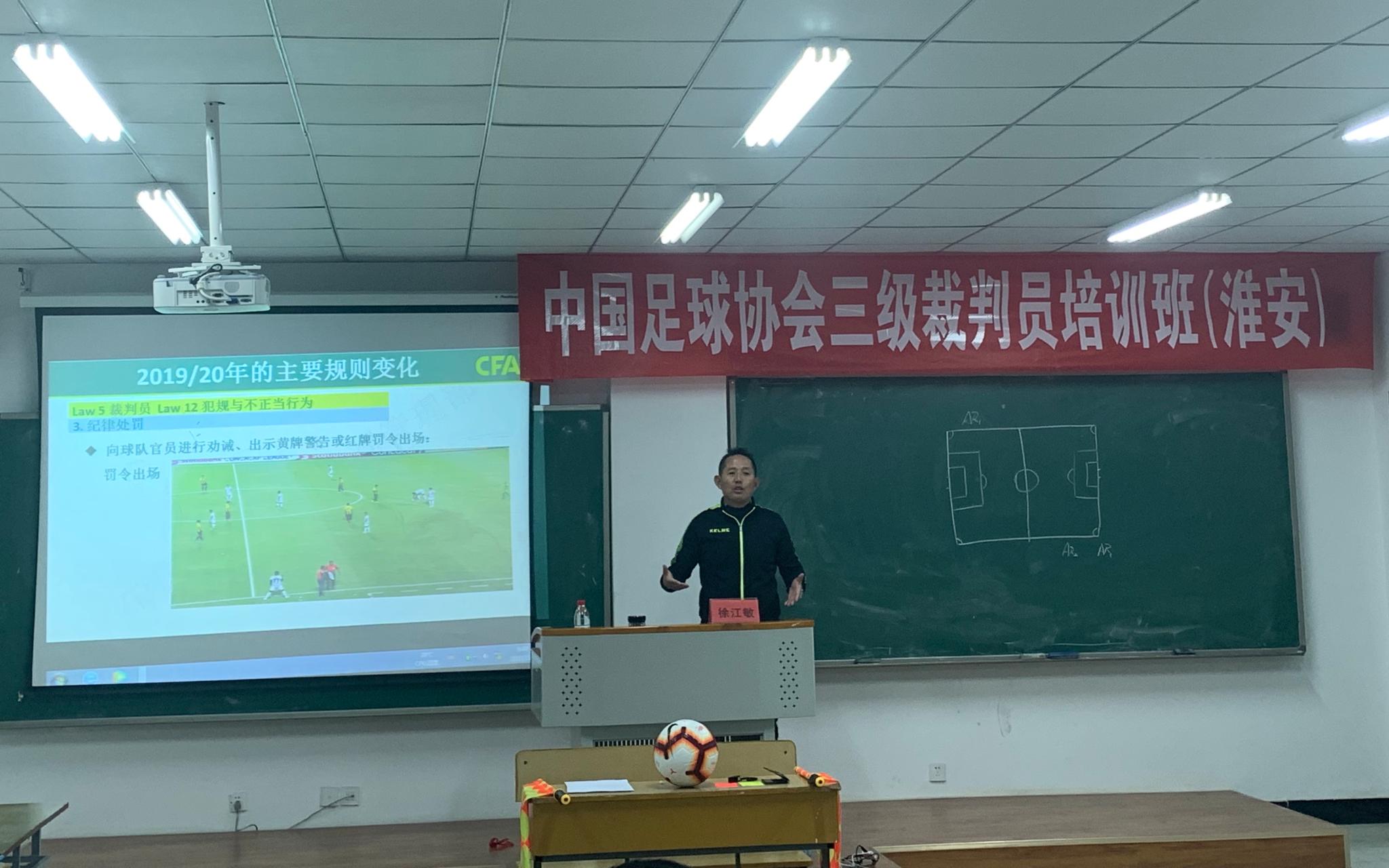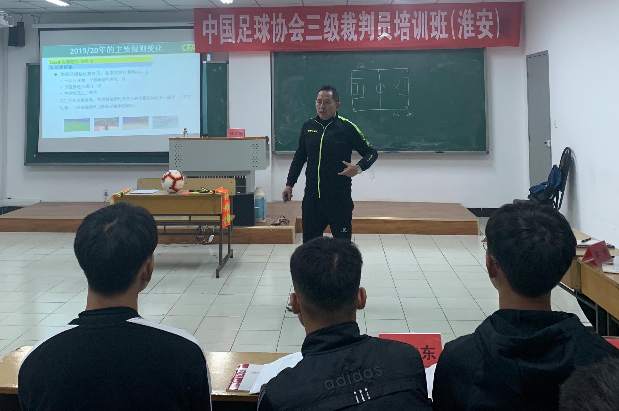 本次三级裁判培训班(淮安)共30人,培训重点对象为淮安市各大高校对足球和足球裁判有极高热忱的学生和淮安本地长期从事足球工作的社会人员。本次培训课程分为三部分,分别为理论部分、实践部分、见习部分。上午学员在AB.COM101教室学习裁判基本理论知识,下午在操场学习边裁基本旗示,并由主讲师徐江敏带往现场参观学习淮安市业余比赛中的裁判。本次培训班为期三天,在11月3日下午5点随着结营仪式的开展顺利结束。