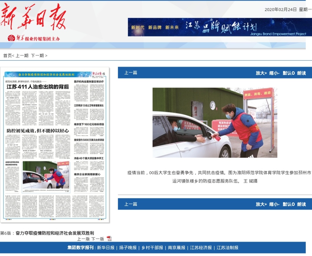 AB.COM12名同学自愿参加社区防控一线的工作,学院通过微信、QQ等平台对先进典型事迹进行宣传报道。其中,19级本科生胡轩铭同学一直坚守在防控一线,服务社区居民。作为一名00后大学生代表,体现了当代大学生奉献青春、服务群众、贡献国家的可贵品质,其事迹受到了新华日报、邳州新闻、学校官网等媒体的报道。