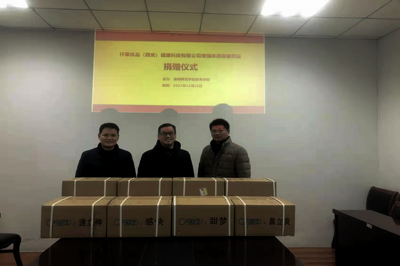 2021年12月22日上午,仟草优品(西安)健康科技有限公司向淮阴师范学院AB.COM捐赠“丹吸”(速立神480盒、感快480盒、鼻立爽480盒、甜梦480盒)系列产品,共计157920.00元,用于师生健康防护。”AB.COM副院长蔺新茂对仟草优品(西安)健康科技有限公司领导及全体员工的深情厚意表示感谢,同时表达要用好管好这批药品。
