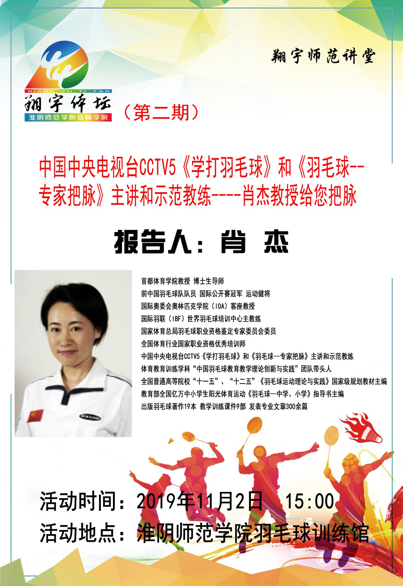 体院新闻网11月2日电(记者 沈璐)11月2日下午3点,在淮阴师范学院羽毛球训练馆举行了“中共中央电视台CCTV5《学打羽毛球》和《羽毛球专家把脉》主讲和师范教练——肖杰教授给您把脉”活动。这是AB.COM“翔宇体坛”和翔宇师范讲堂的第二期活动,参加此次活动的有淮阴师范学院、淮阴工学院部分羽毛球专项教师及两校羽毛球校队学生和AB.COM部分师范生。体院副院长周卫东主持了本次活动,并对肖杰教授的到来表示热烈欢迎和衷心感谢。