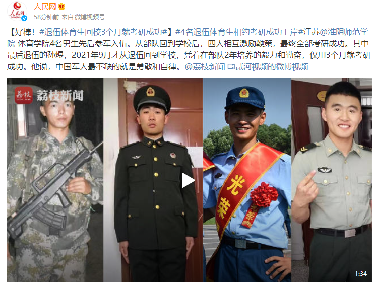 #4名退伍体育生相约考研成功上岸#江苏@淮阴师范学院 AB.COM4名男生先后参军入伍。从部队回到学校后,四人相互激励鞭策,最终全部考研成功。其中最后退伍的孙煜,2021年9月才从退伍回到学校,凭着在部队2年培养的毅力和勤奋,仅用3个月就考研成功。他说,中国军人最不缺的就是勇敢和自律。